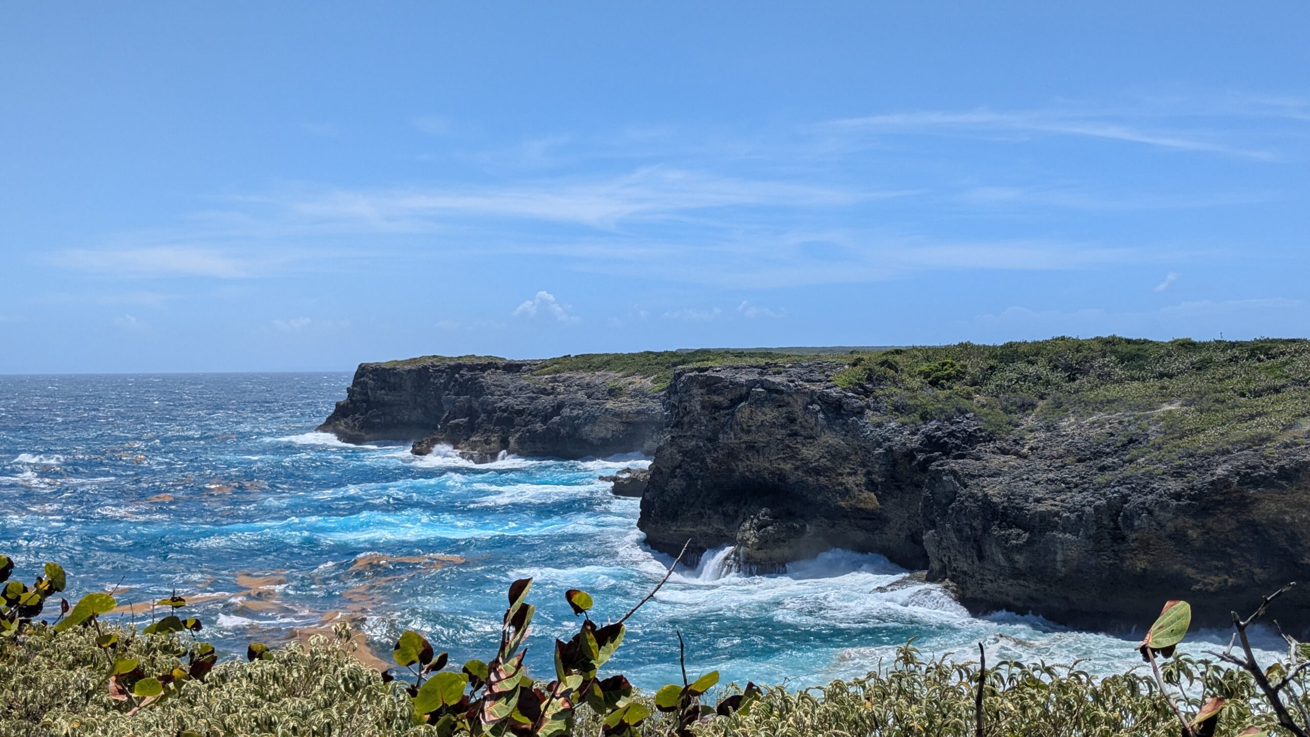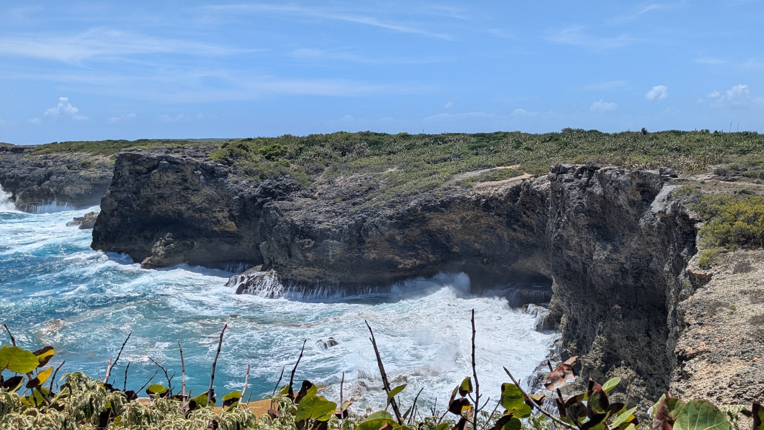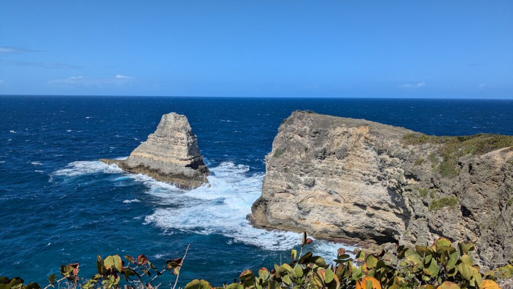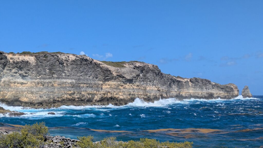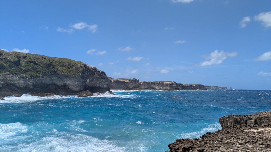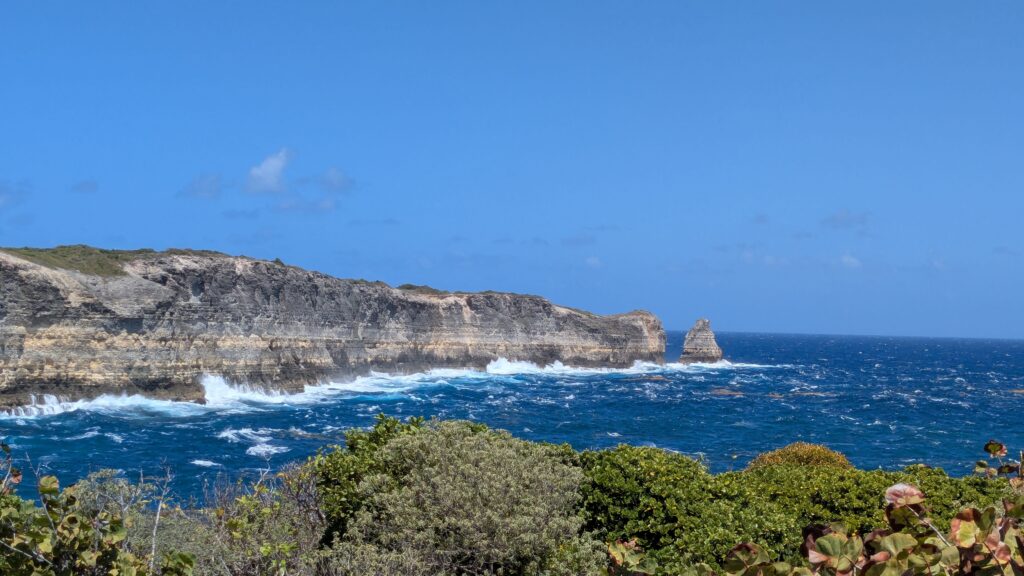 Située sur la côte de la Grande-Terre, la Porte d’Enfer est un joyau naturel de la Guadeloupe. Ce magnifique lagon, aux eaux calmes et turquoise, est enserré par d’impressionnantes falaises qui le protègent de l’océan agité. C’est le point de départ d’une randonnée côtière inoubliable, la trace des Douaniers, qui longe le littoral sauvage. Après une marche spectaculaire au sommet des falaises, le sentier mène jusqu’au site du Souffleur, où l’océan s’engouffre avec une force saisissante dans une cavité rocheuse, créant à chaque vague un puissant geyser maritime. Cette balade offre un contraste spectaculaire entre la quiétude du lagon et la puissance brute de l’Atlantique.